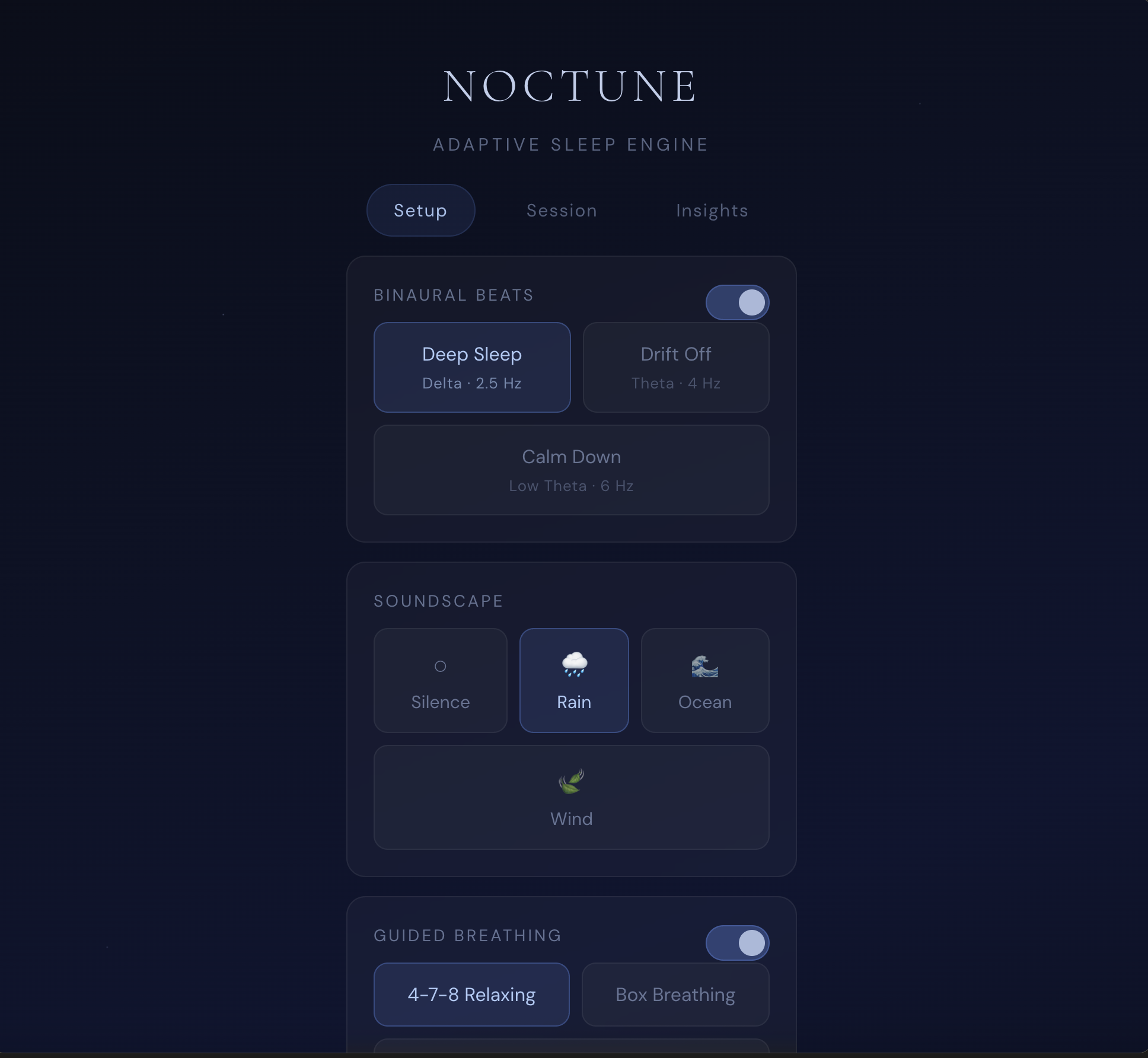 Noctune is a closed-loop sleep aid that adapts in real-time to help you fall asleep. It detects your movement through your phone's accelerometer and automatically adjusts binaural beat frequencies, breathing pace, and soundscape volume based on your sleep state. The adaptive engine tracks five phases — Awake, Relaxing, Drowsy, Light Sleep, and Deep Sleep — and makes continuous adjustments every 500ms. When restlessness is detected (like restless legs), the engine boosts masking sounds and shifts binaural frequencies to re-engage your focus. As you settle, it sweeps frequencies toward deep delta, decelerates your breathing guide by up to 50%, and fades volume to silence. Features include three binaural beat presets (delta, theta, low theta), three soundscapes (rain, ocean, wind), three breathing patterns (4-7-8, box, military), auto-fade, a live movement waveform, real-time engine parameter display, and an adaptation log showing every decision the engine makes. Built with React and the Web Audio API. No accounts, no tracking, no ads. Runs entirely in your browser.